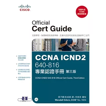 《CCNA ICND2 640-816專業認證手冊 第三版》是Cisco官方推薦的學習教材之一,包括來自授權的Cisco學習合作夥伴的模擬試題、實機訓練以及Cisco Press的自學產品。欲得知有關講師培訓、電子學習、授權Cisco學習合作夥伴提供的實機訓練,請造訪www.cisco.com/go/authorizedtraining。